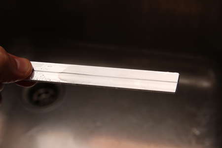 Es empfiehlt sich, insbesondere wenn das Werkstück gefärbt werden soll, einen Test mit Material gleicher Legierung zu machen. In diesem Fall wird es ein Teststreifen, bei dem ich verschiedene Färbzeiten ausprobiere, um anschließend den richtigen Farbton zu erwischen.