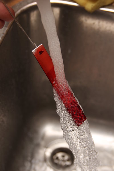 Also, Werkstück rein und wenige Minuten (hier 2 Minuten) drin lassen und vorsichtig bewegen. Anschließend am Draht herausnehmen und unter fließendem Wasser gut abspühlen. Danach das kalkhaltige Kranwasser mit destilliertem Wasser wegsprühen.