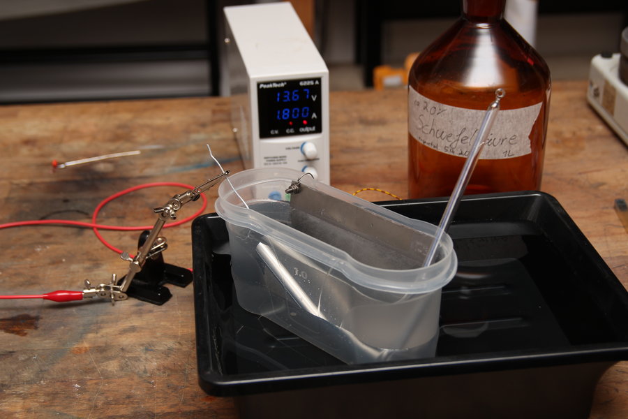 Dann gehts ins Eloxierbad, welches aus ca. 20% Schwefelsäure besteht. Die knapp 40%ige "Akkumulatorensäure" hab ich dazu 1+1 mit dest. Wasser gemischt.