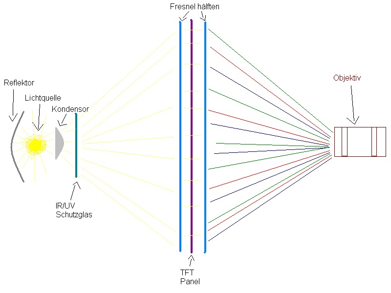 über das Objektiv wird das Bild vom TFT an die Wand Projeziert.