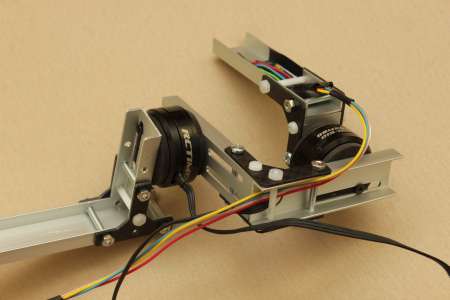 Dann mussten die Teile mit den Motoren nurnoch zusammengeschraubt werden. Die IMU wird im inneren des Aluprofils aufgeklebt, auf dem die Kamera nachher sitzt. Die Kabel von der IMU zum Controller müssen sehr flexibel sein, da sich sonst das Gimbal nicht ausbalancieren lässt.