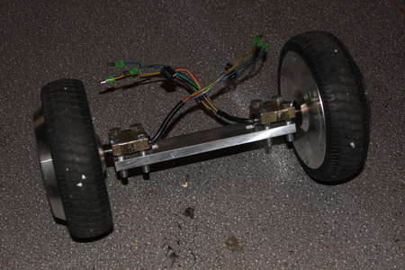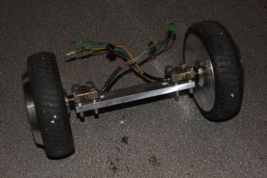 To keep the wheels from twisting I mounted them to a 1cm thick aluminium bar. The short thread screws were later replaced by better fitting 30mm long M8 ones.