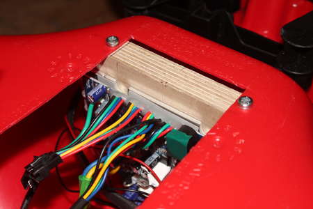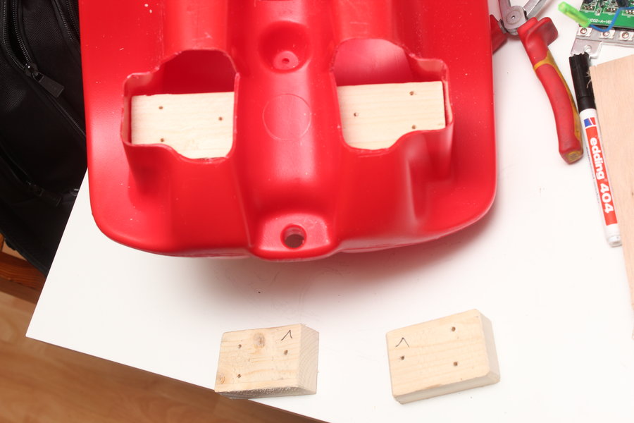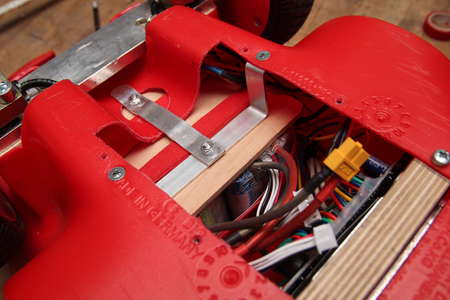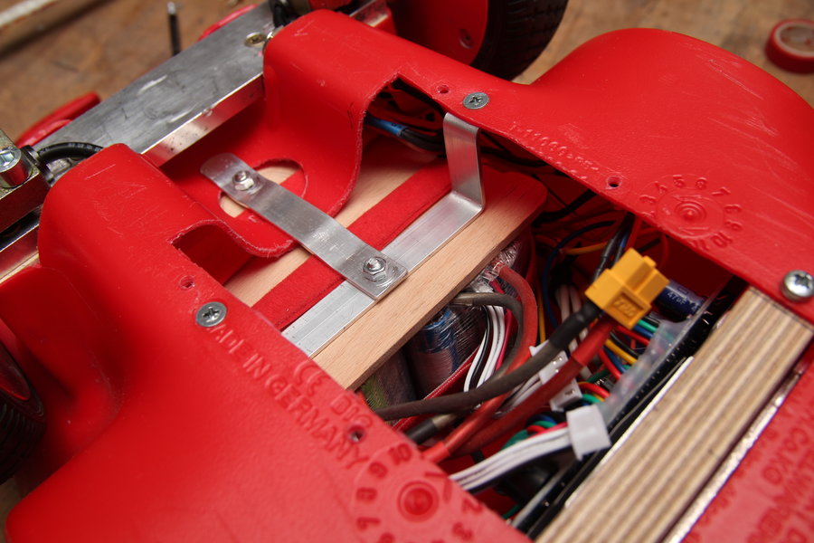 First the protruding plastic piece had to make way. A wooden plate was used to strap the batteries onto with, of course, red velcro strip and then using bent aluminium profiles to screw it to the plastic.