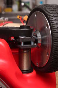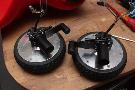 The shaft of the hoverboards wheels has to intersect the rotational axis of the steering spindle. Because the wheel shaft has to be held down somehow this was not as simple as it was with the stock wheels.