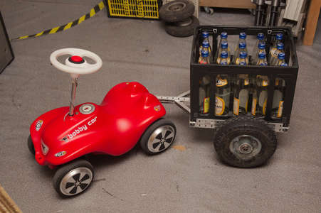 The test track of our Chaos West Assembly was perfect to test the Bobby Car. There I noticed that the front wheels have no grip on the floor of the exhibition hall of Messe Leipzig and that steering above 10km/h is not possible.