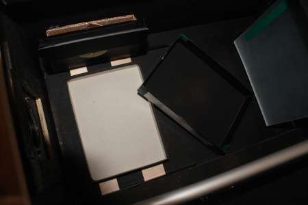 Das Papier legen wir jedoch nicht mehr direkt auf die Mattscheibe, da wir die Vermutung haben, dass Licht beim Belichten durch das Papier dringt und es von hinten belichtet. Daher kommt zuerst ein Einsatz mit einem schwarzen Hintergrund davor. Dieser wird unter das Gummiband geschoben und unten mit Magneten befestigt. Er besitzt zudem an drei Seiten Führungen für das Papier, was das Einlegen fehlerunanfälliger macht.
