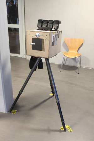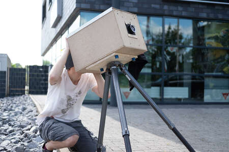 Dabei handelt es sich um eine Holzbox mit Objektiv und einer im Inneren verschiebbaren Mattscheibe, auf die, nach dem Fokusieren durch ein Fenster am hinteren Ende, ein Fotopapier gelegt wird. Durch Entfernen des Objektivdeckels kann so für ein paar Sekunden das Papier belichtet werden. Anschließ wird das Bild direkt in der Box selbst entwickelt. Hierbei entsteht ein Negativ, welches anschließend vor dem Objektiv platziert und "abfotografiert" wird.