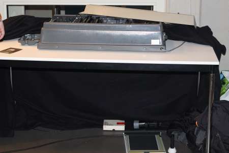 Auf dem Tisch in der grauen Eurokiste steht ein Film / Fotopapiertrockner. Die nassen Papiere wurden dort mit Gewichten eingehangen und waren in wenigen Minuten trocken.