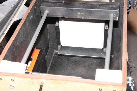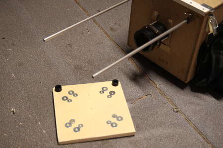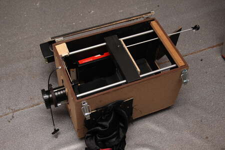 Die Mattscheibe ist oben an einem Holzblock befestigt, welcher an zwei Schienen aus Alurohr vor und zurück geschoben werden kann. Dazu ist eine Gewindestange nach hinten herausgeführt. Je weiter die Mattscheibe vom Objektiv verschoben wird, desto näher liegt der Fokuspunkt.