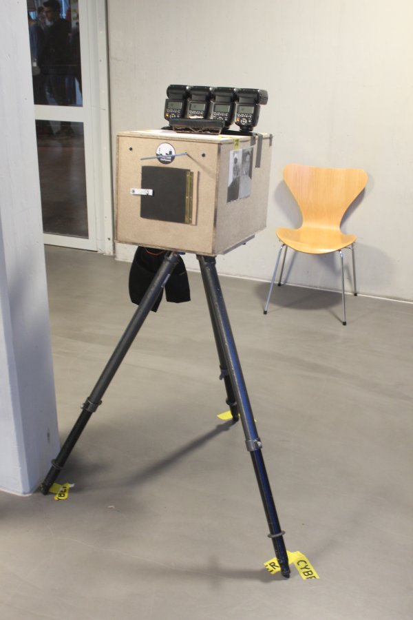 Dort haben wir die Box Kamera mit eingepackt und am zweiten Tag auch Fotos gemacht. Wie zuvor erwähnt sind indoor Belichtungszeiten von mehreren Minuten nötig. Das Papier (altes Ilford Ilfospeed 3.24M) haben wir zuvor auf ISO 1.5 geschätzt, was die Sache auch nicht einfacher macht.