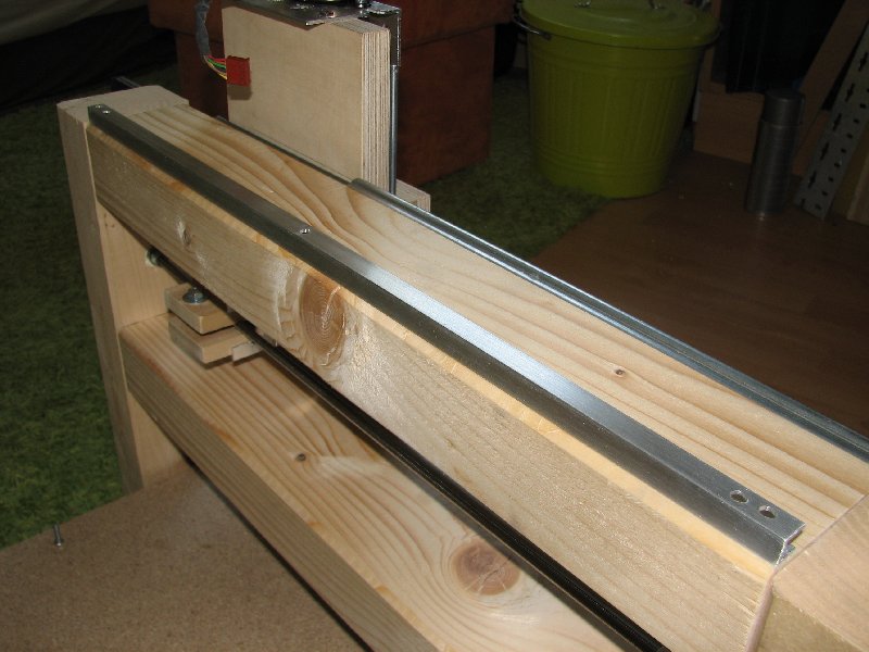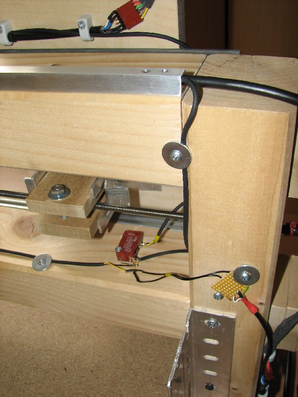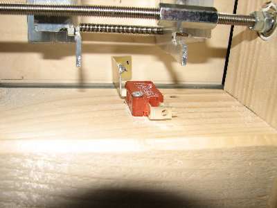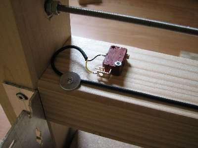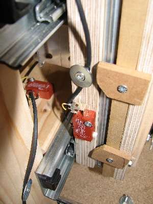 Die Z-Achse hab ich etwas kreativer gestaltet; Dort wird der Taster von zwei Holzblöcken mit abgeschrägter Kante bei Erreichen der Endpositionen betätigt.