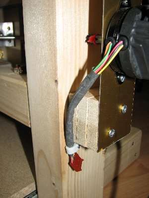 Das dünne Kabel, welches alle Taster verbindet ist mit Schraube und Unterlegscheiben an dem Holzgerüst festgeklemmt.