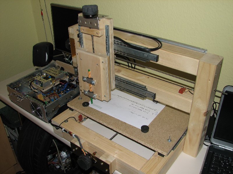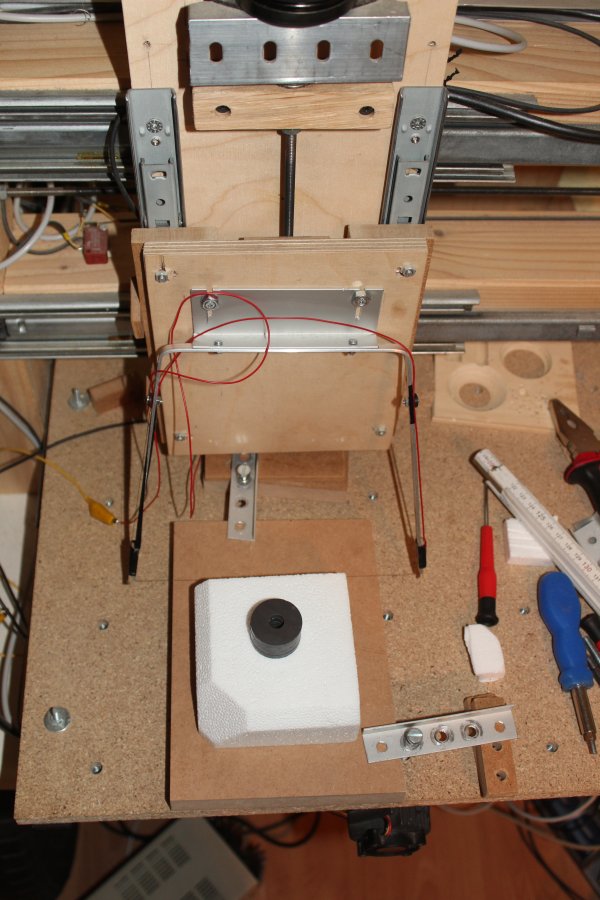 Eines Samstag Mittags packte mich die Langeweile und der Dremel war eh grad von der CNC abmontiert, also schnell ein Winkel an die Z-Achse und den Styroporschneider drangeschraubt.