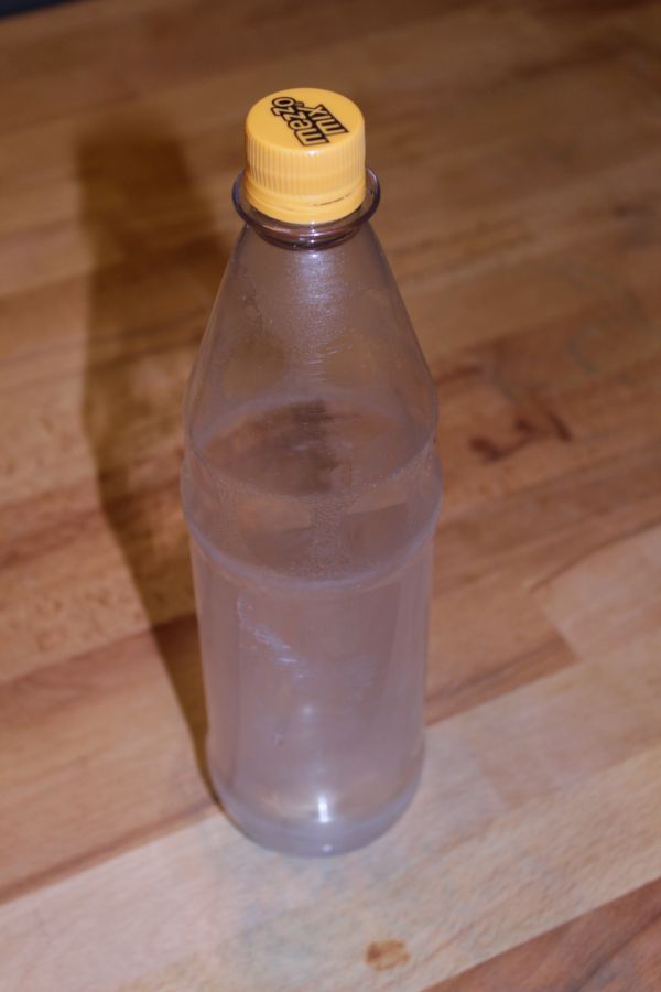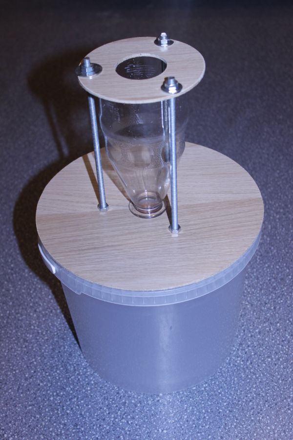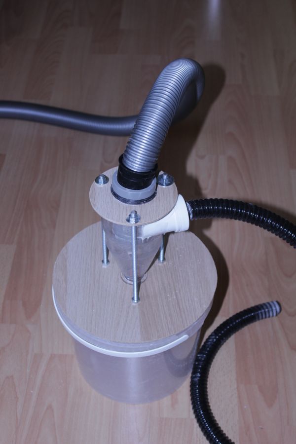Ein Zyklonabscheider besteht aus einem Behälter in dem der abgetrennte Staub gesammelt wird und einem "Trichter" (Fachbegriff: Bunker). Nachdem die ganzen Schaumwaffeln vernichtet waren konnte ich den leeren Plastikeimer wunderbar als Sammelbehäter verwenden. Eine leere Colaflasche eignet sich ebenso gut als "Trichter", da dieser aus einem Einlaufzylinder und einem Kegel bestehen muss.