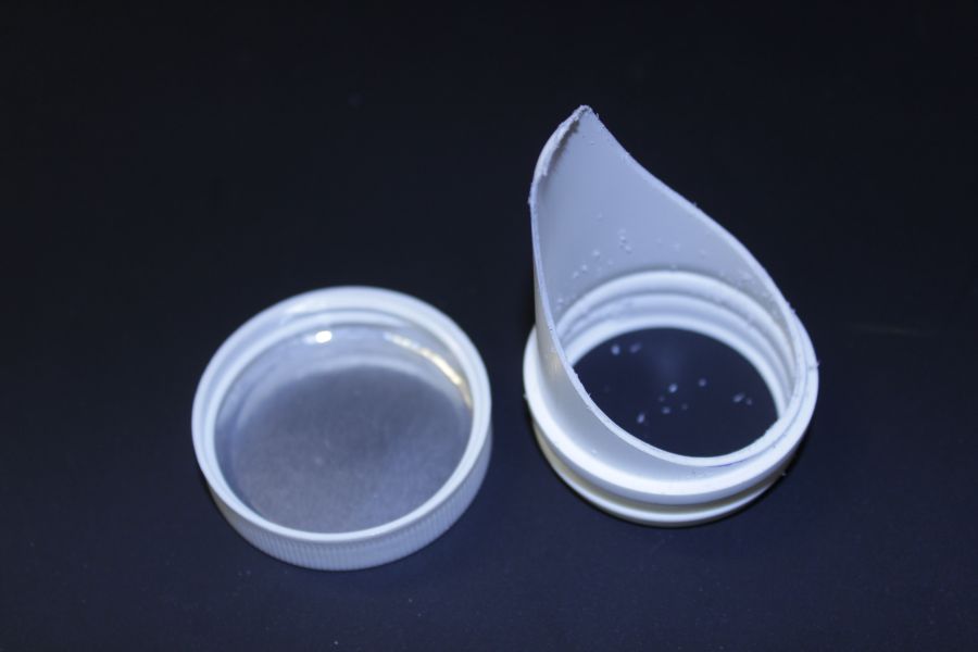 Von der Flasche wird nur die obere Hälfte benötigt. Ein Teil (Zylinder) als Einlauf und einen kegelförmigen Teil darunter der dafür sorgt, dass die Partikel weiterhin an die Aussenwand gedrückt werden und dadurch nach unten befördert werden, wo sie letztendlich in den Behäter fallen. Da der Behäter weitestgehend Luftdicht ist kann der Staub nicht mehr angesaugt werden und sammelt sich dort.