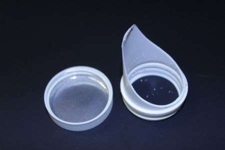 Nun fehlt nur noch das Tauchrohr durch welches die Luft vom Staubsauger angesaugt wird. Ein kleines Plastikrohrstück passt perfekt von oben in den "Trichter". Der schwarze Stopfen der in dem Rohr steckt dient dazu, die angesaugte Luftmenge etwas zu redusieren, da das Rohr mit Innendruchmesser 40mm für die kleine Colafalsche etwas überdimensioniert ist.