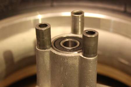 For the 26mm ballbearing (26mm outer, 10mm inner diameter) to fit in the rim, I needed to remove some material off the rim, after that the bearing went straight in by the use of a piece of wood and a hammer.