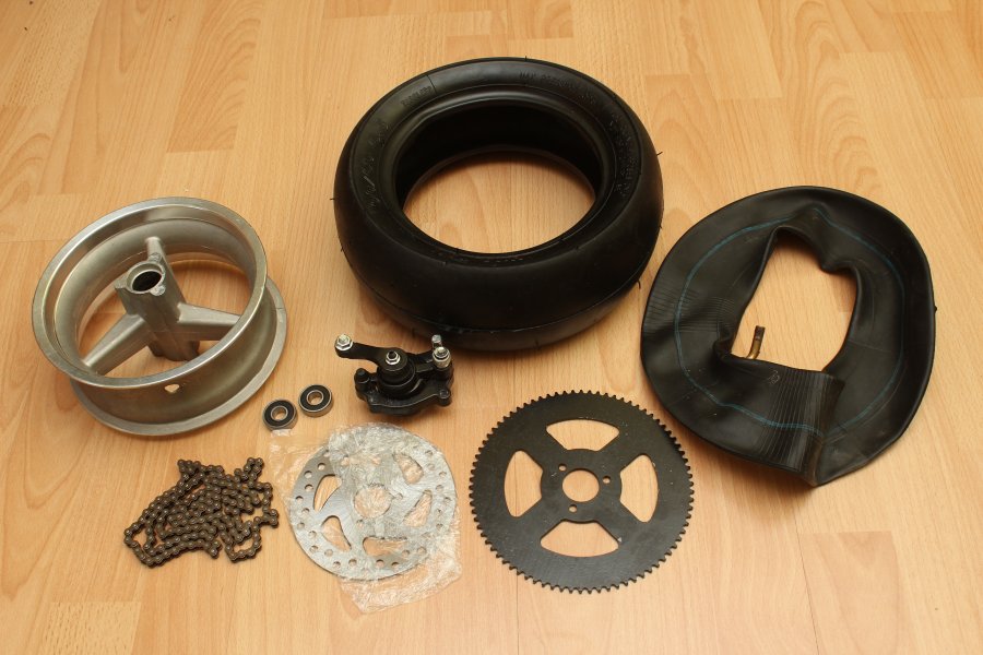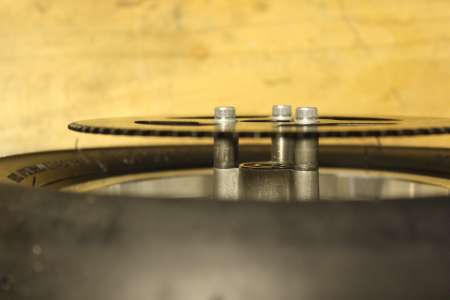 On the side where the chain wheel gets mounted I had to put three spacers in between, so that the chain does not scratch the wheel. The brake disk get mounted on the other side of the rim where I had to drill and tap three M5 holes.