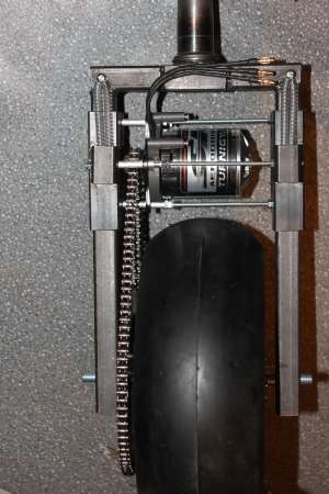 The motor gets mounted on top of the fron wheel between the sides of the fork, where it will drive the wheel directly through a chain.