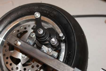 Because the cart will have a topspeed of 50km/h (~ 30mp/h) a brake is not a bad idea. The disk for the disk brake is already mounted to the wheel rim. The brake itself has two holes with M6 threads for mounting where I attached two small pieces of steel. Then I placed the brake on the disk where and pulled the lever with a wire so it doesn't move.