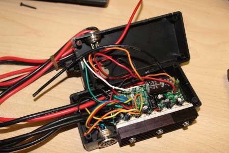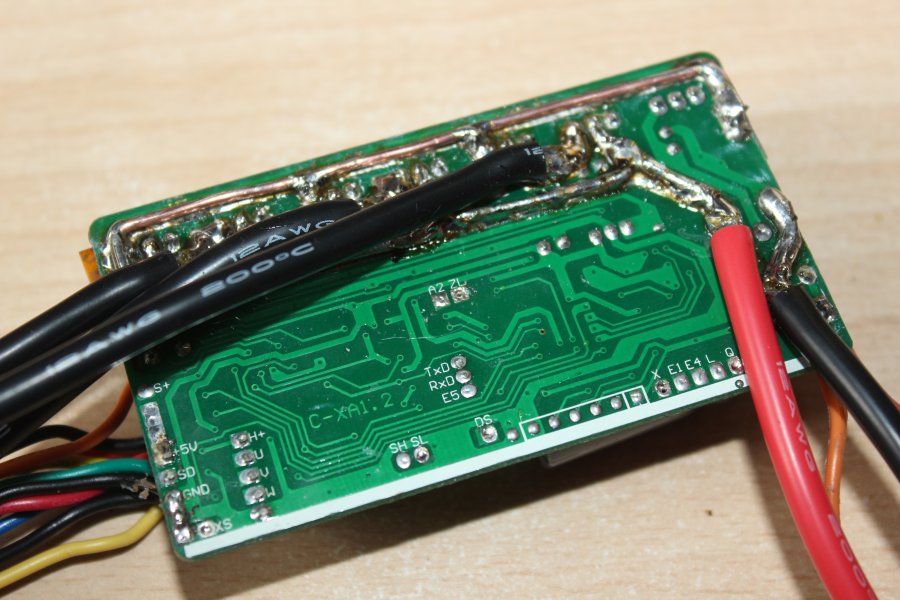 Later I am going to change some of the wires and solder in some bigger ones (10AWG - 12AWG Silicon wire), especcialy those coming from the batteries and those going to the motor. Also I will solder some copper wires directly to the pcb traces wich carry a lot of amps.