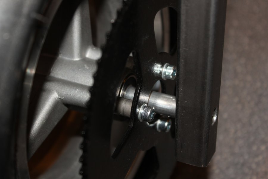 The space on the left and right side of the wheel on the threaded rod was filled by some aluminium tubes, so that the brake can be mounted to the brake disk as well as having enough space on the other side for the chain not touching the wheel fork.