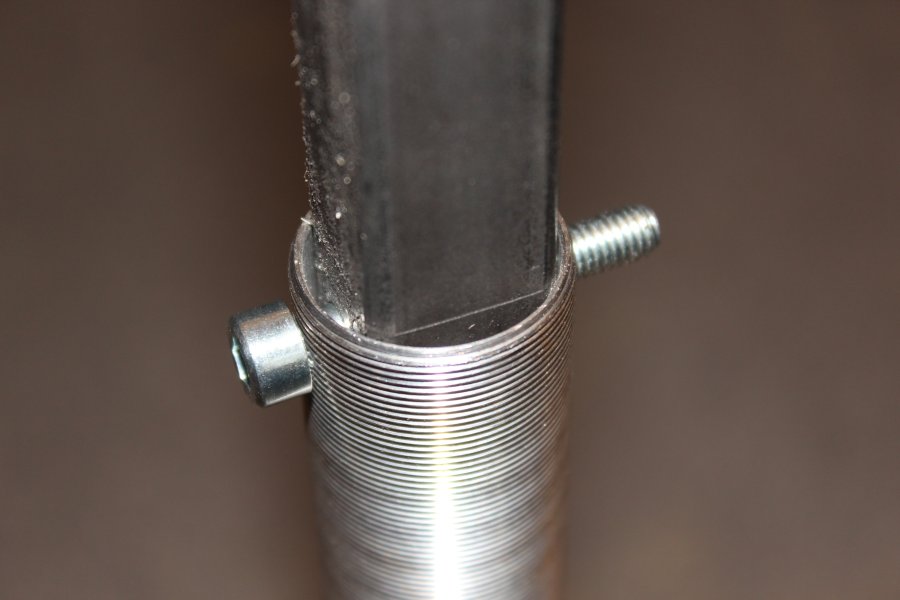 Next I needed to attach the steering wheel to the steer tube in some way, but it had to be also detachable so the headset for example can be removed later. Fortunately a 20 by 20 steel section fits just fine into the tube. So I drilled a 6mm hole through both the tube and the square steel section. By inserting a M6 screw the steering wheel is secured against twisting.