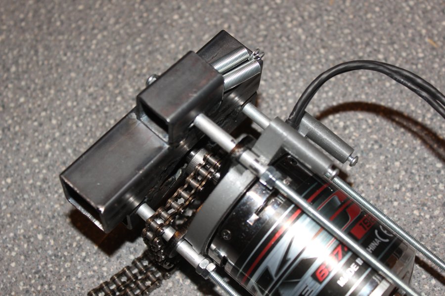 With the chain attached it now has to be tensioned. So I tried a dynamic type of tensioning and used on each side two springs to pull the motor assembly up. Sadly, the chain does slip on high torque so I will try to use some stiffer springs.