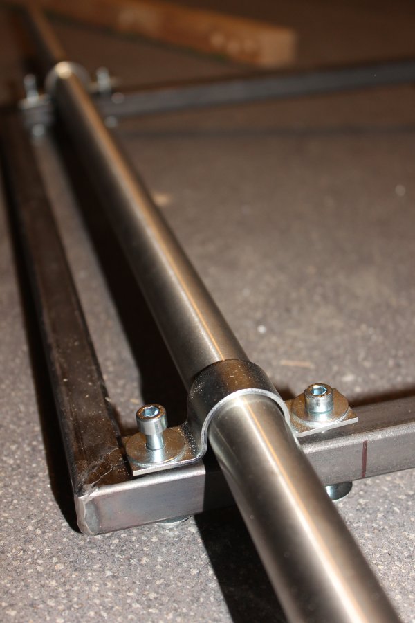 Jumping over to the backside of the cart. The back wheels with their assembly will get mounted on a 25mm stainless steel tube wich is simply held on the frame by two clamps.