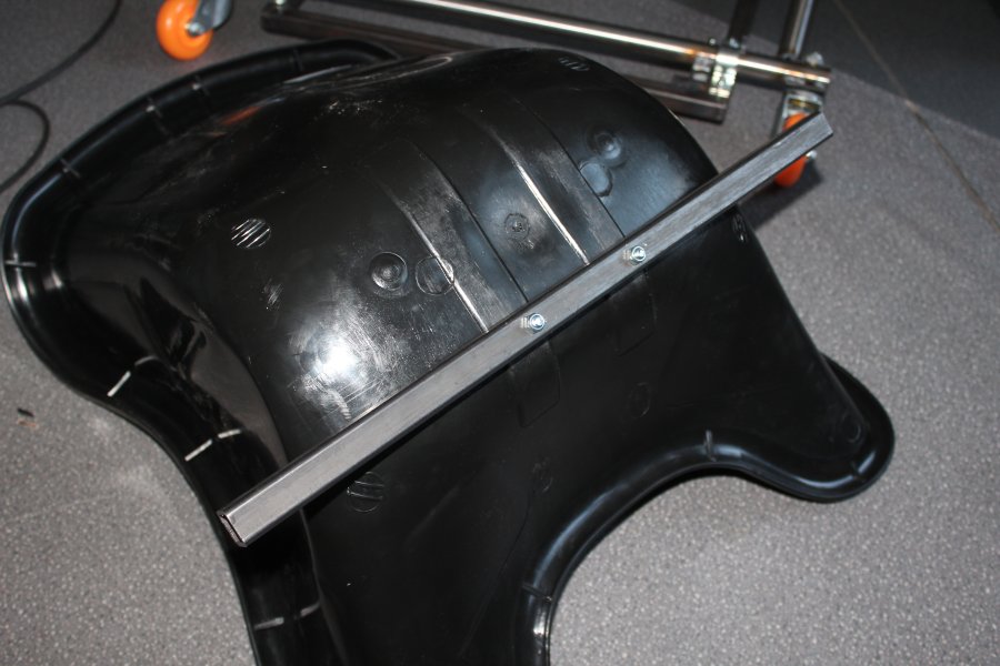 The most pressure will most likely be applied straight down, so I mounted a 20x20 steel section with M6 screws to the bottom of the seat. Next I drilled two holes trough both seat and frame at the front and screwed them together. With the seat held in place by those screws I was able to weld the steel section at a slight angle between the frame.