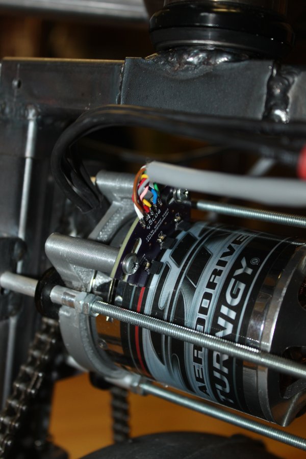 Then the cart was placed on a table so that the front wheel is able to spin free. Without the hall sensors the motor runs as expected. By applying too much throttle the controller will cut out while freewheeling in consequence of the maximum commutation frequency of the controller. On start up the motor cogs, because it has to be "pushed" randomly by the controller so it can determine it's position (see