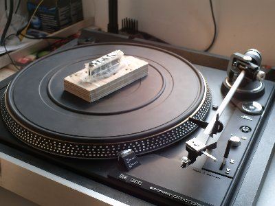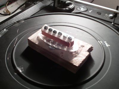 Dazu befestige ich den PU auf einem Holzstück. Es ist durch ein Loch in der Mitte gut am Plattenspieler befestigt.
