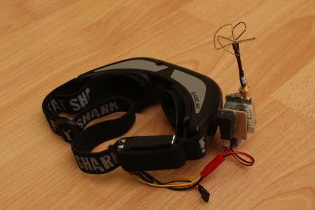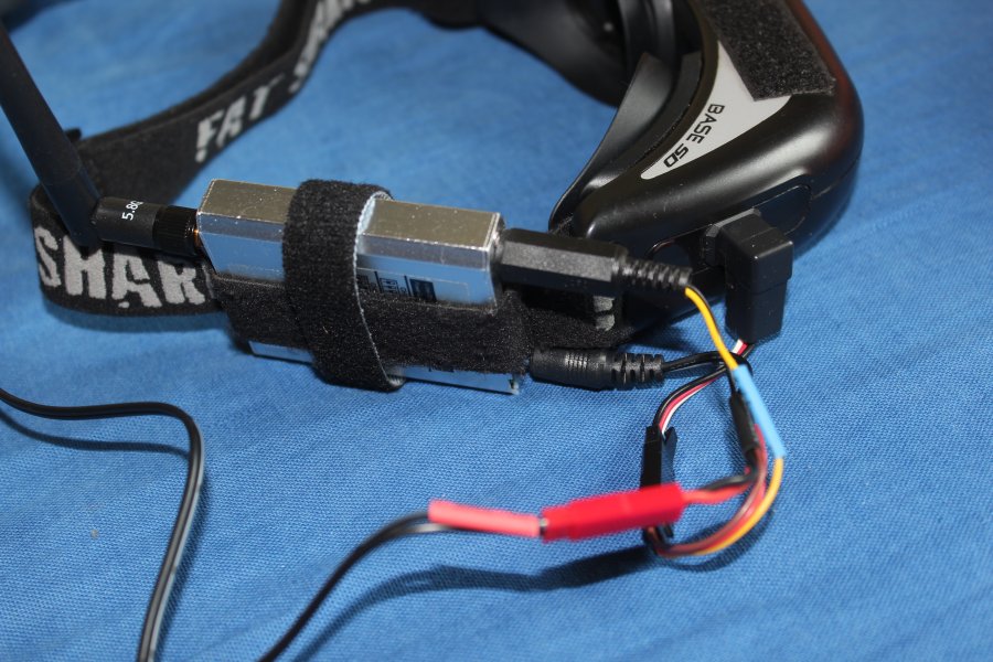 Power for the goggles and the receiver comes from a 3S, or even better 2S LiPo/LiIon Battery at the other end of a long cable.