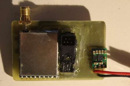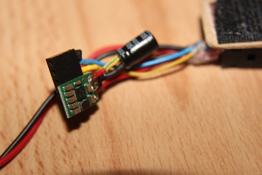 The circuit board is designed to be glued to the Futaba connector and so attached to the video goggle. The 5V for the ATTiny and the Module are generated by a 5V Pololu Stepdown, The fatshark gets its >5V directly from a 2S Lipo.