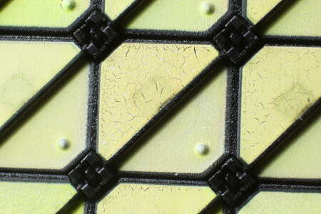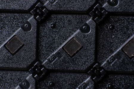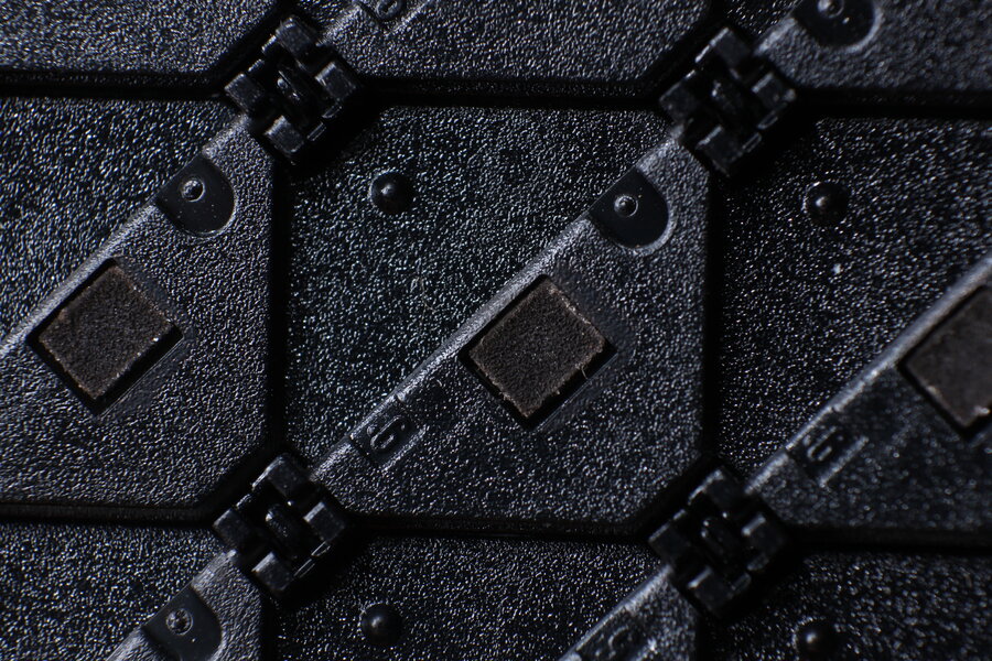 Jedes Flipdot ist ein 10 mm x 10 mm groß und diagonal getrennt in schwarz und gelb fluoreszierend. Mit UV Licht leuchten sie dadurch hell grün.