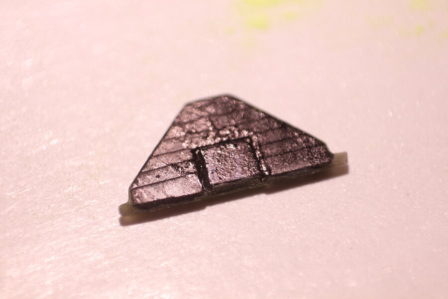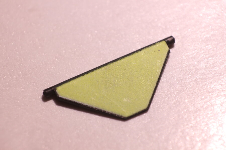 Darauf befestigt ist ein dreieckiges Plättchen mit schwarzer Rückseite und gefärbter Vorderseite. Diese klappe ist so befestigt, dass sie diagonal umklappen kann. Ein kleiner Magnet ist dazu darin eingelassen.