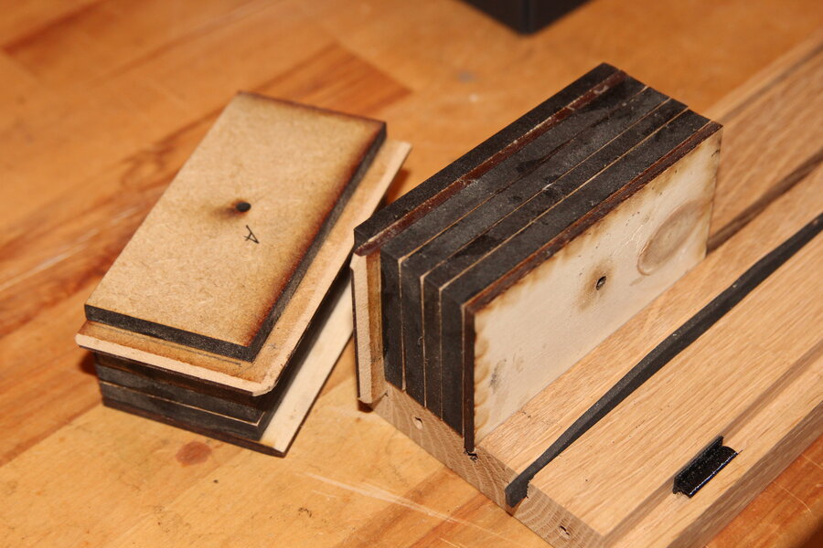 Ein Stapel verschieden dicker holzplatten passt in zwei der hinteren Nuten. Diese Blöcke dienen als Wandhalterung.