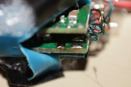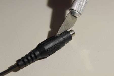Diesen Schaltregler gilt es nun zu befreien. Dazu schneidet man am besten mit einem scharfen Messer entlang der "Naht" auf beiden Seiten. Die äußere Gummihülle lässt sich danch auseinanderziehen und abreißen bzw abschneiden.
