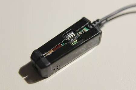 Als nächstes gehts an den Sender. Das Plastikgehäuse besteht aus zwei Hälften. Es reicht die Folie auf beiden Seiten einzuschneiden und die Teile sanft auseinander zu hebeln.