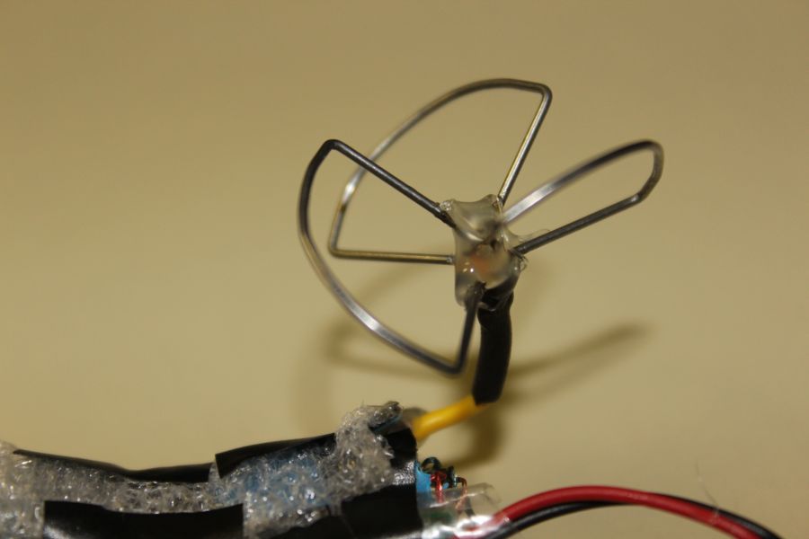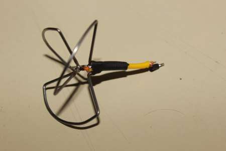 Anleitung aus Stahldraht zusammengelötet. Das Coaxialkabel ist vergleichsweise sehr dünn, dafür aber leicht, gut biegsam und nicht ganz optimal für 5.8Ghz, was aber auf 1-2cm länge zu verkraften sein sollte.