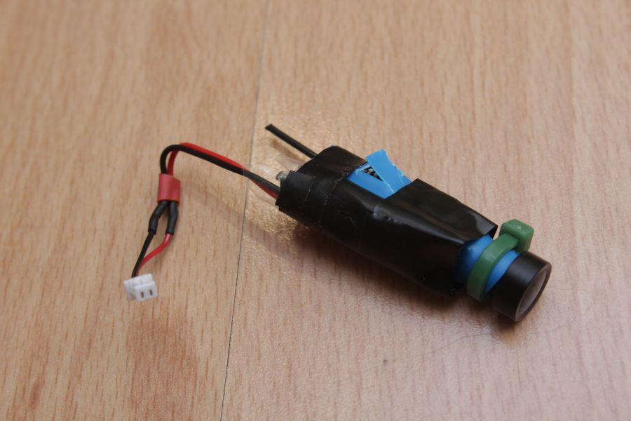 Da die Linse von selbst nicht hält wird sie mit Schrumpfschlauch befestigt. Mit einem Kabelbinder über dem Gewinde sollte die Linse auch im Flug nicht mehr rausfallen.