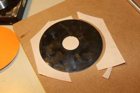 The double sided tape is then used to attach sand paper to it. Also the inner and outer circle have to be cut out.