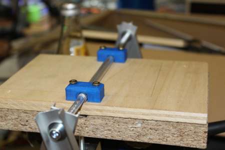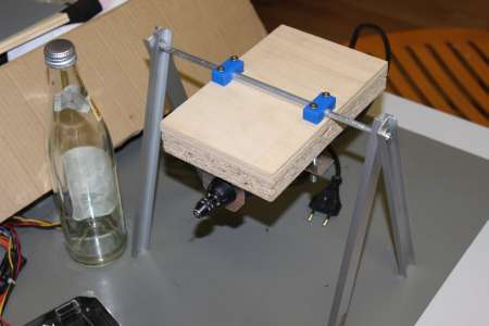 To be able to use the Proxxon for this a new holding contraption was needed. A welded angle piece holds another hard drive on the side. The motor of this HDD is solely used because of its bearing. There a wooden plate is mounted to fasten the Proxxon to it. This can than rotate around like before.