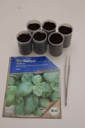 1-3 Samen Basilikum oben drauf und täglich mit Wasser besprüht.