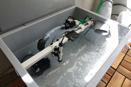 Das Wasser zirkuliert dabei mithilfe einer Pumpe aus einem Reservoir durch das Rohrsystem. Ein Fluss von 2 L/min ist dabei ausreichend.