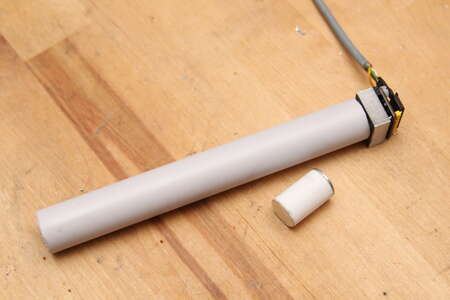 Der Sensor hatte dennoch etwas Schwierigkeiten die Innenwände des Rohres von dem Schwimmer zu unterscheiden. Um dies zu verbessern ist eine reflektierene Aluminiumfolie (Zerschnittener Deckel einer Dose) aufgeklebt.