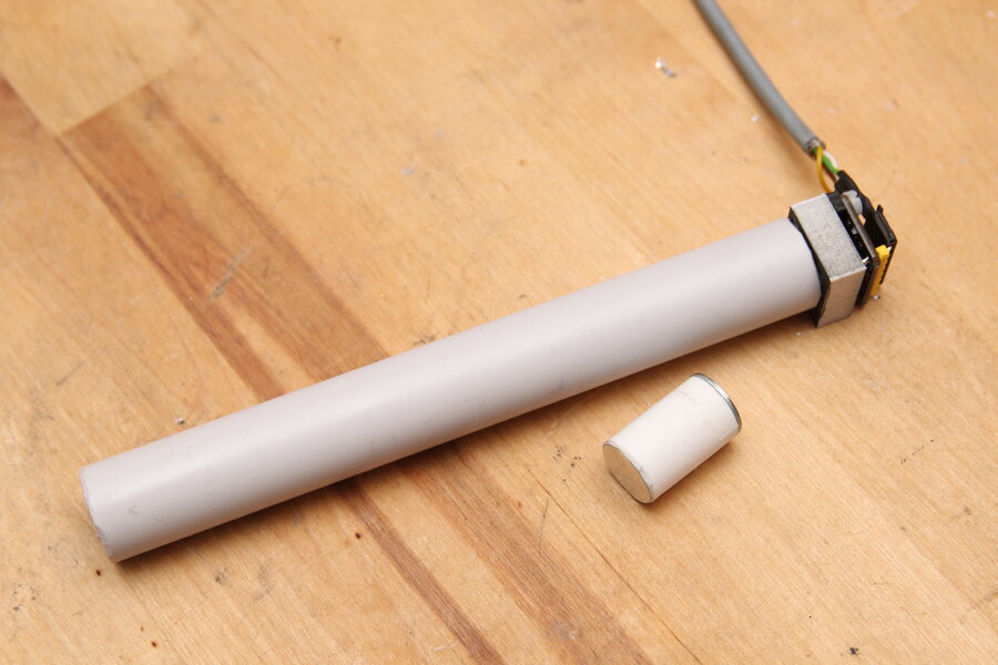 Mit dem Sensor senkrecht auf einem 20 mm (OD) PVC Rohr schaffe ich eine solche kontrollierte Umgebung. In das Rohr wird ein PETG Zylinder mit Hohlraum als Schwimmer geschoben.