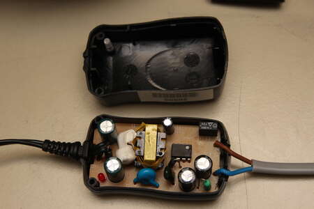 In der Netzteilkiste lag ein sehr kompaktes 12 V 500 mA Steckernetzteil. Der Stecker wurde abgesägt und die Kabel an der Eingangsseite herausgeführt.