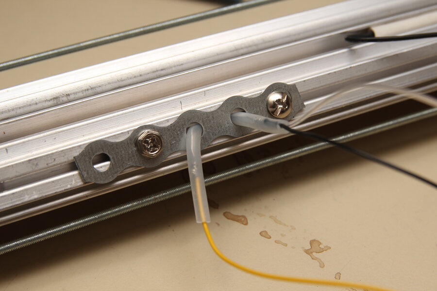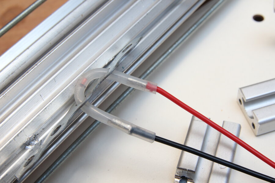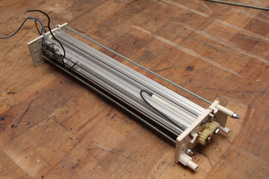 Ohne das Plastikgehäuse halten die Teile im Bild jedoch nicht lange zusammen. Zwei Gewindestangen wurden dazu angebracht, um die Seiten an die Aluextrusion zu pressen.