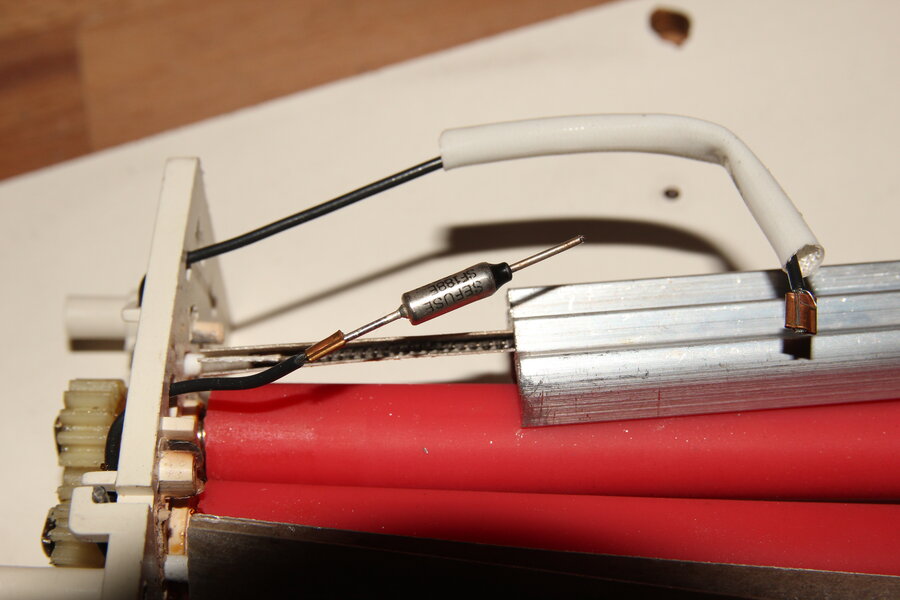 Da gerade kein Ersatz greifbar war kam dort ein stück Draht rein. Aus einem defekten Bügeleisen hatte ich zuvor eine bimetall Temperatursicherung ausgebaut und am Alublock des Laminators angeschraubt und in Reihe mit dem Heizelement verbunden.